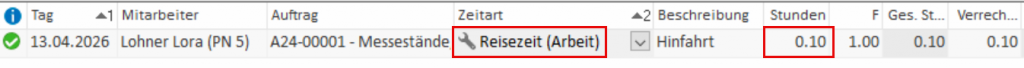 Hier wird die Reisezeit auf der Zeitart “Reisezeit” erfasst. Damit kann sie von der übrigen Arbeitszeit getrennt ausgewiesen werden (zu Dokumentationszwecken) und kann dennoch auch einem Auftrag zugeordnet werden (freiwillig).