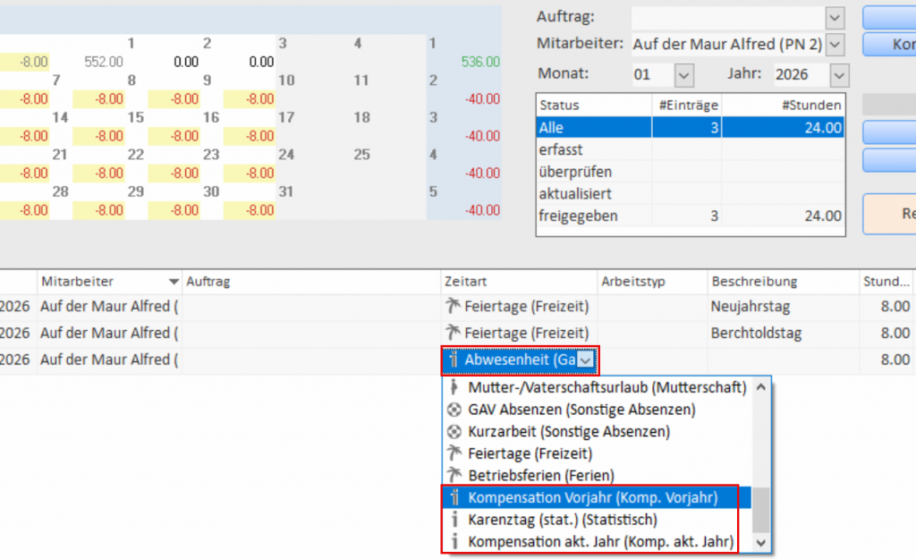 Dieses Vorgehen hatte den Nachteil, dass man nicht (bzw. nur im Beschreibungstext) unterscheiden konnte, ob sich die Kompensation auf den Überzeitsaldo des Vorjahres bezog oder Überzeit des laufenden Jahres kompensiert wird.