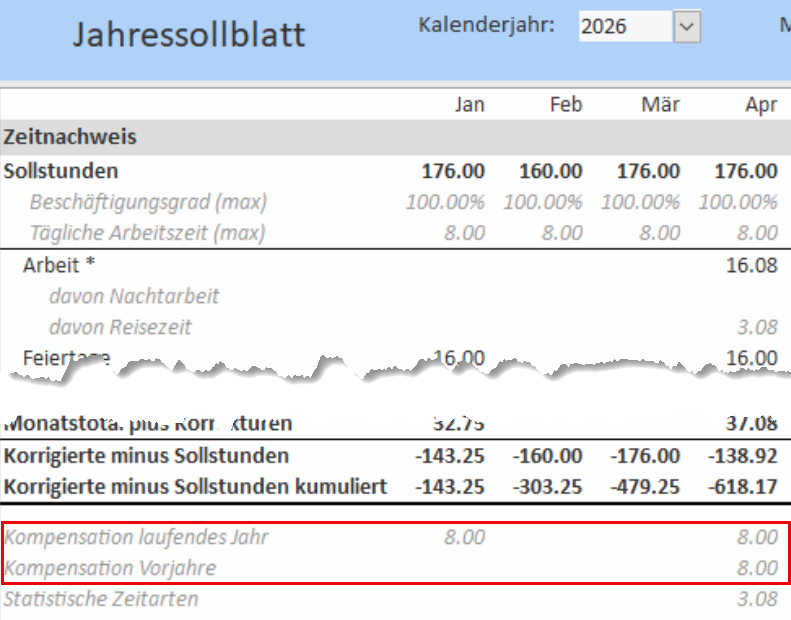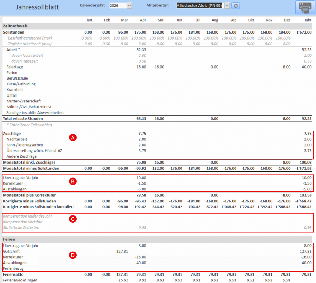 Das Jahressollblatt wurde so angepasst, dass Zeitkompensationen, Zeitzuschläge sowie Zeit- und Ferienkorrekturen getrennt ausgewiesen werden (vgl. Bild):