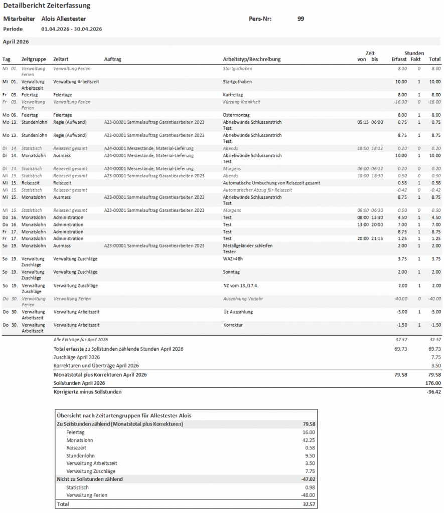 Der Detailbericht enthält neu auch die Zeitgruppen, den Arbeitstyp und die von/bis-Zeiten, sofern erfasst.