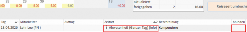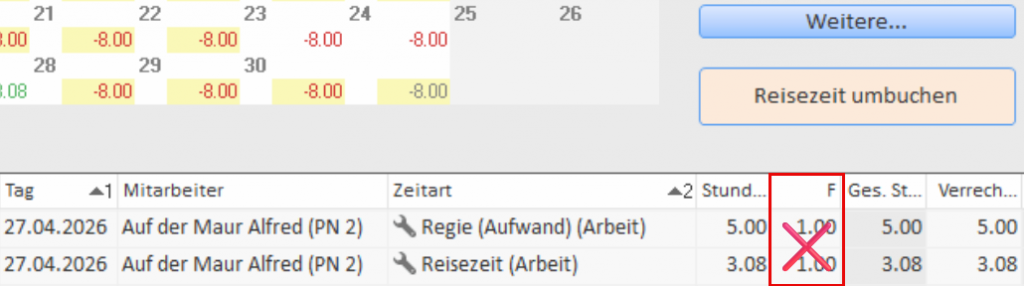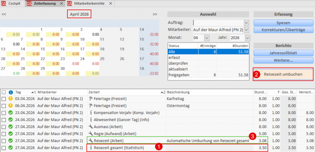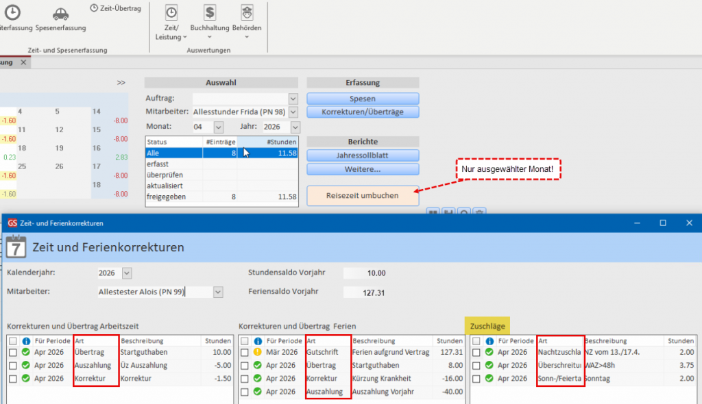 Wichtig: Das Drücken auf den Knopf “Reisezeit umbuchen” betrifft immer alle Mitarbeiter des angezeigten Monats (hier April 2026).