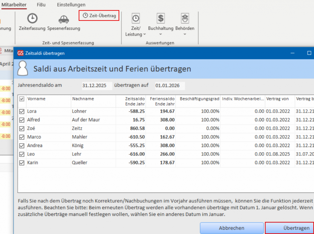 Um diese Differenzen zu beseitigen, können Sie den Zeitübertrag vom 2025 nach 2026 einfach noch einmal ausführen!